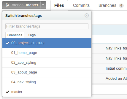 Alternatively, you can use GitHub's web interface to view each checkpoint. Click on the branch menu and select the checkpoint you want to view, shown below: