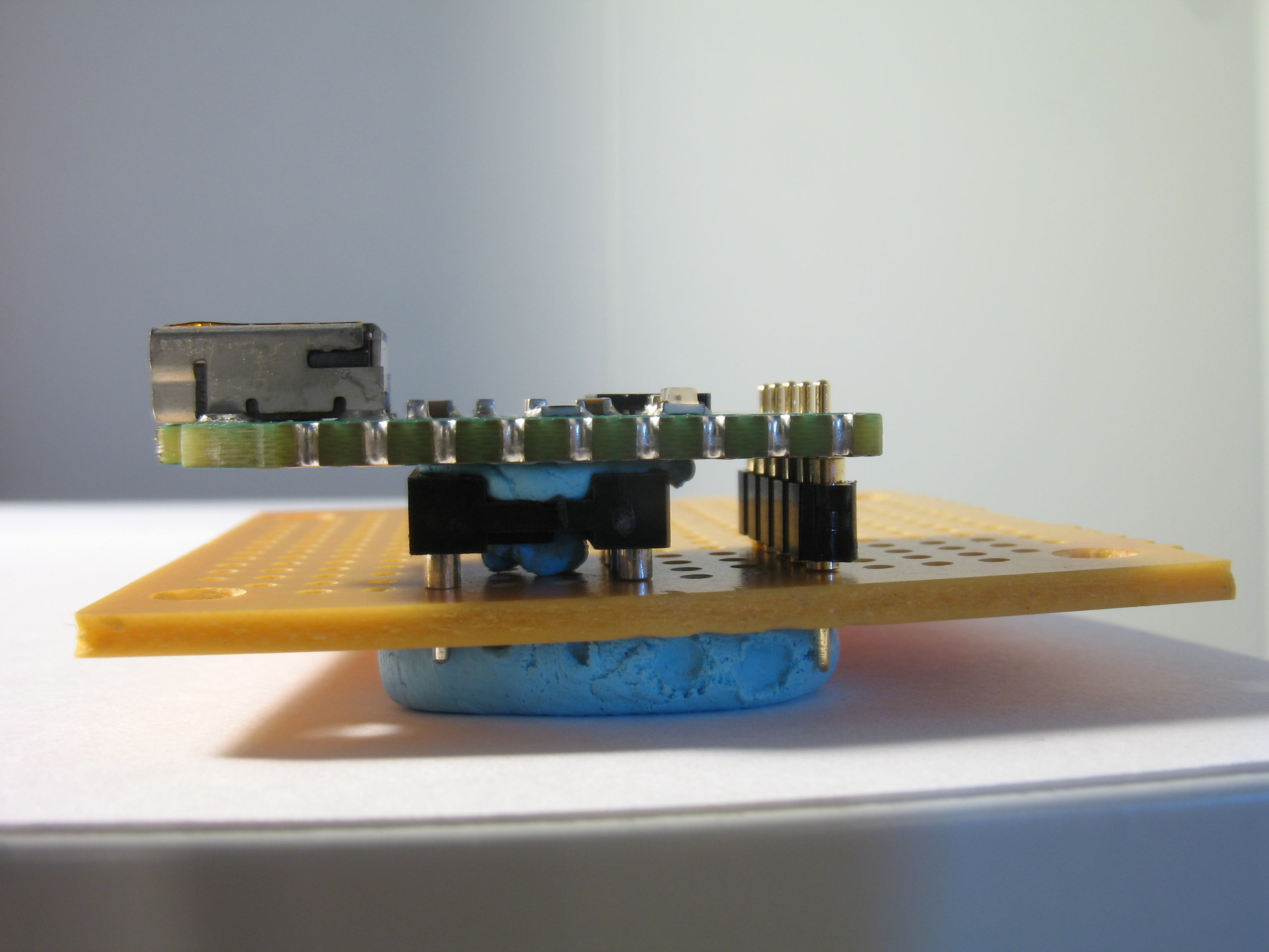 Solder the two remaining female header strips on the opposite side of the perfboard from the pins that will not be soldered to anything else.