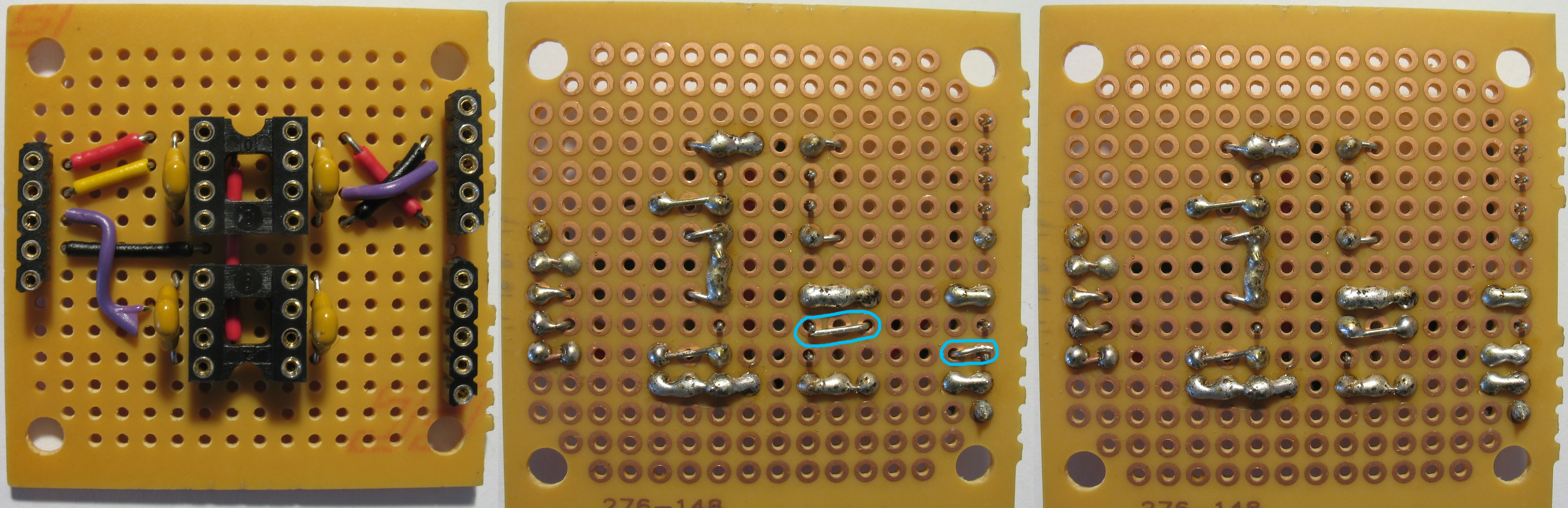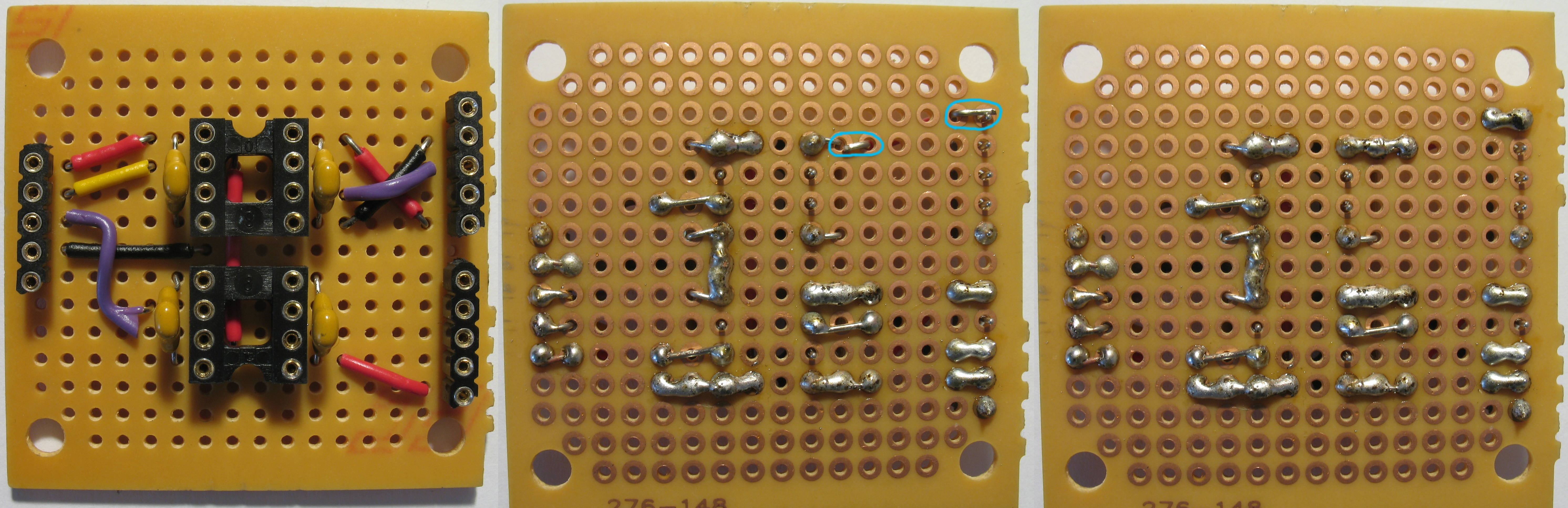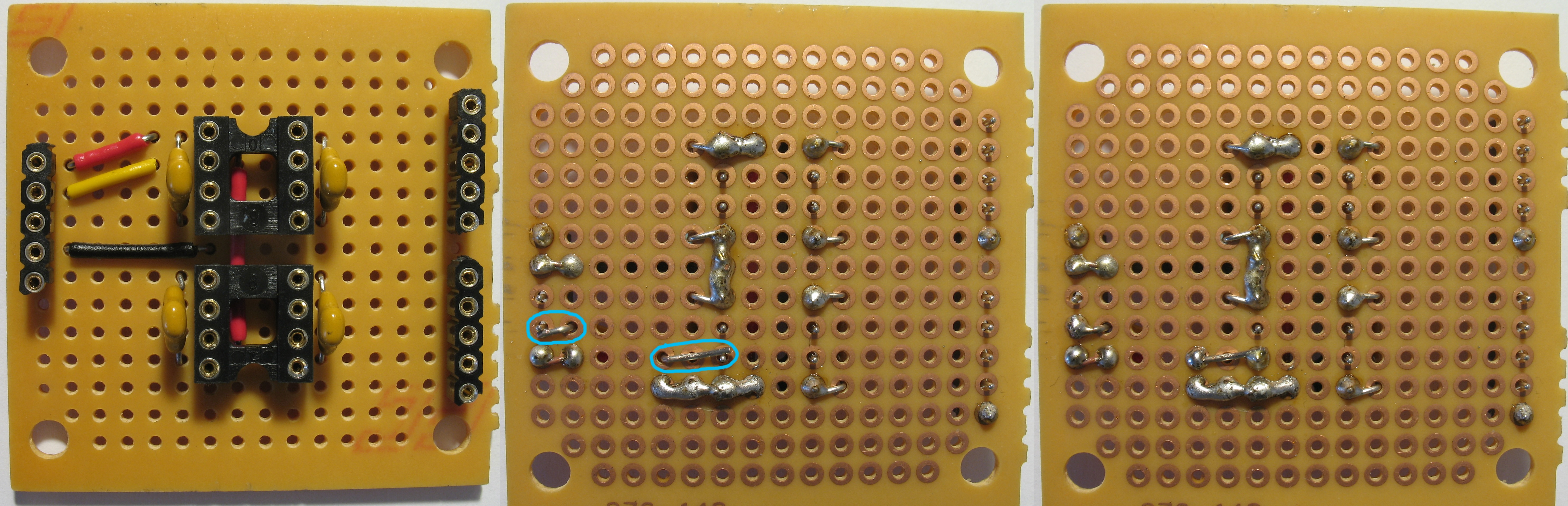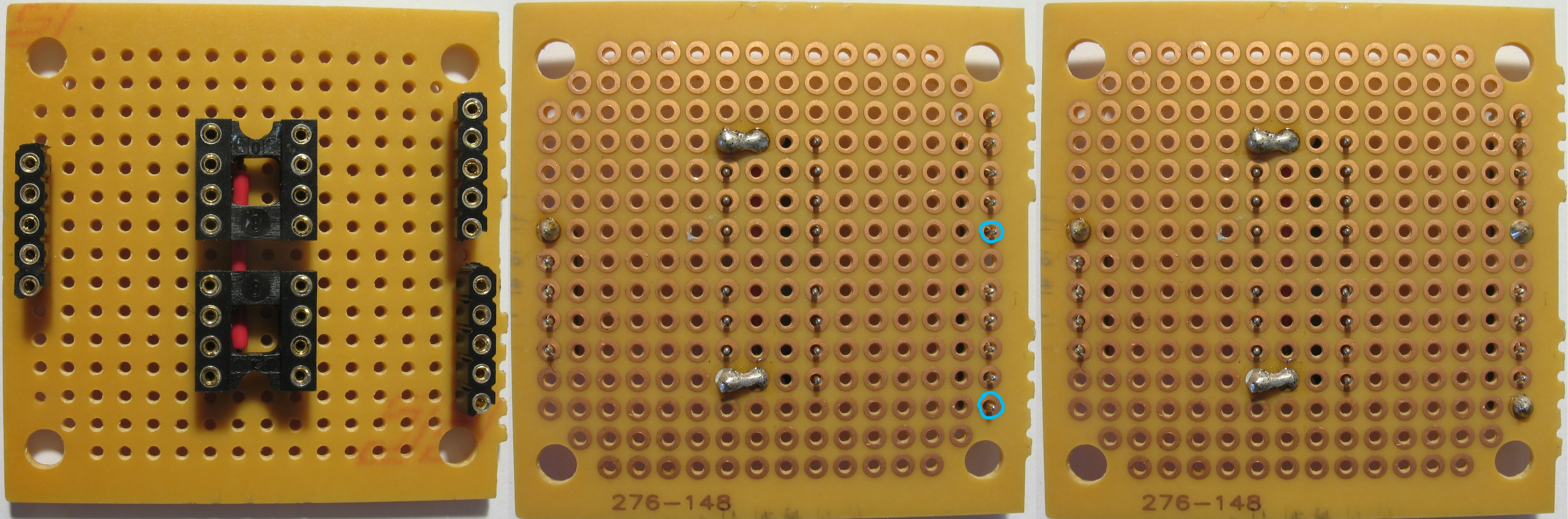 Start the assembly by placing a jump-wire on the perfboard. Place the DIP8 sockets as depicted so that the jump wire goes under it. Pay attention to the orientation of the notches in the sockets: The notches should point in opposite directions to act as a guide for optocoupler orientation later. Measuring and cutting the jump wiring takes a surprising amount of time. Use this handy guide if necessary. You can also buy ready-made kits. Note that the jump wire insulation might not be heat resistant.