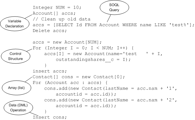 datatype variable_name [ = value];In Apex, statements must end in a semicolon and can be one of the following types: