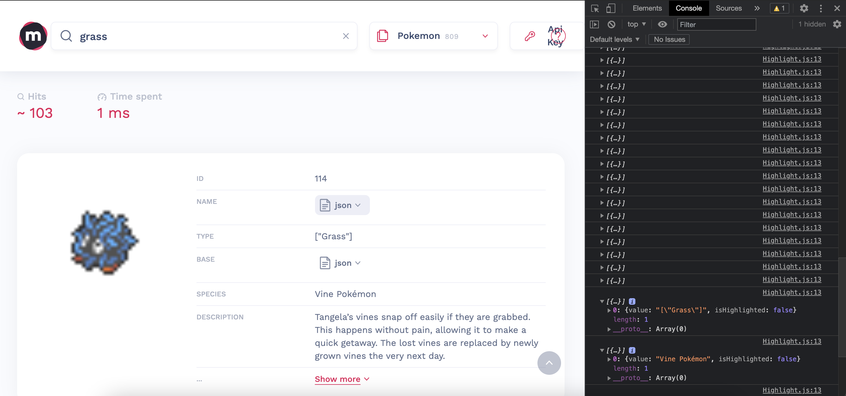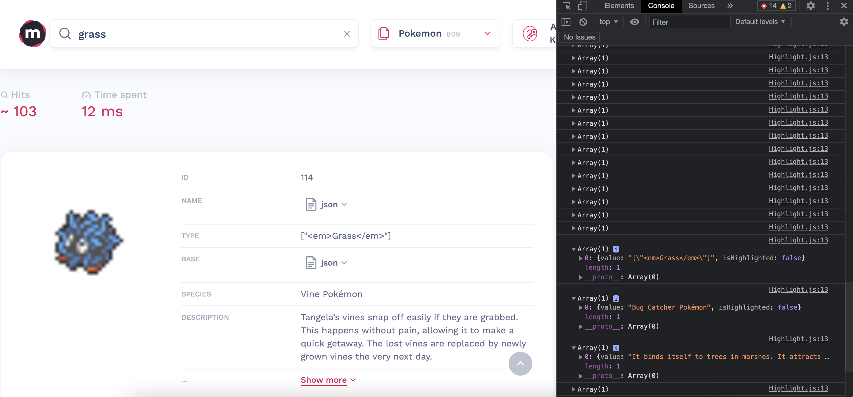 By using the v0.21 of MeiliSearch with the version 0.5.0 of Instant MeiliSearch, I receive some fields with <em> tags inside.