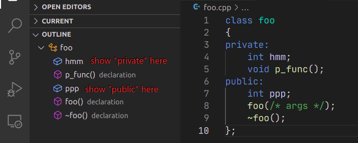 I found #3117 and microsoft/vscode#113845 discussing similar problem. Actually I only want some extra small, grey text showing private or public beside the names of class members, just like what "declaration" does now.
