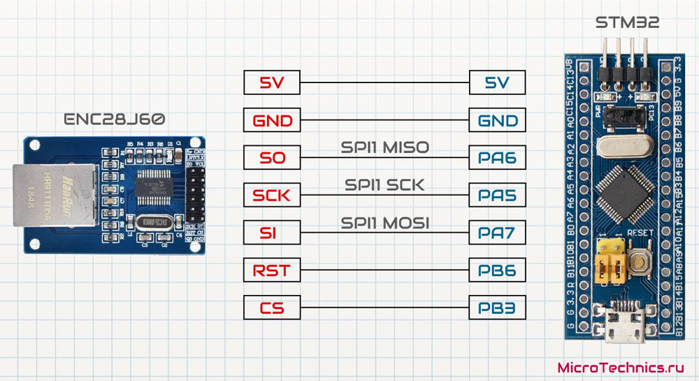 Bunch of projects for STM32 Ethernet connection based on ENC28J60 IC physical layer. The first part is devoted to creating ENC28J60 SPI driver and its configuration and setting up. Here is a basic connection diagram: