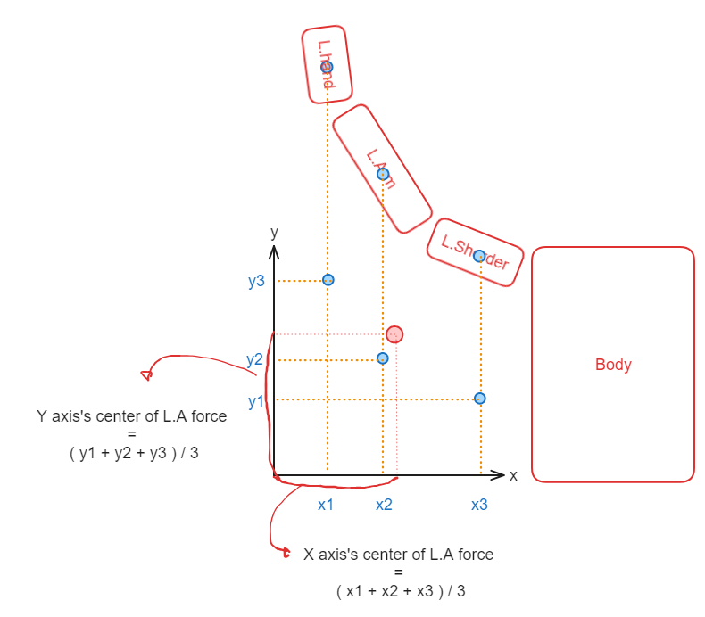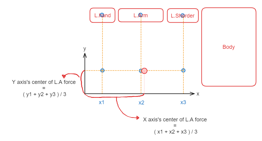 ⑥ 1) Body C.G and foot C.G. 2) Only use X axis. 3) I use this distance difference to basis of judgment