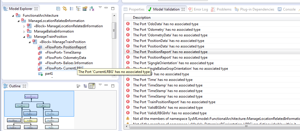 The SysML model must hold certain rules to be able to be correctly transformed to SCADE, Classical B, etc. In order to maintain these rules, the plugin contains a definition of constraints, utilizing the Eclipse Validation Framework. Violations will be highlight within the model via markers. To start the model valdation, right click on the SysML model in the Model Explorer and select Validation > Select constraints and Validate model