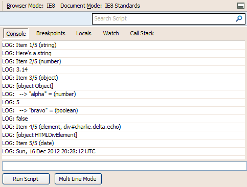 This is an optional plugin to provide help information about the data that is being logged, especially in IE and older browsers. Just include consolelog.detailprint.js along with consolelog.js.