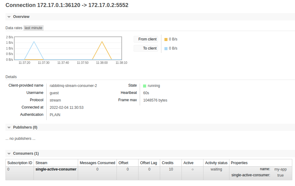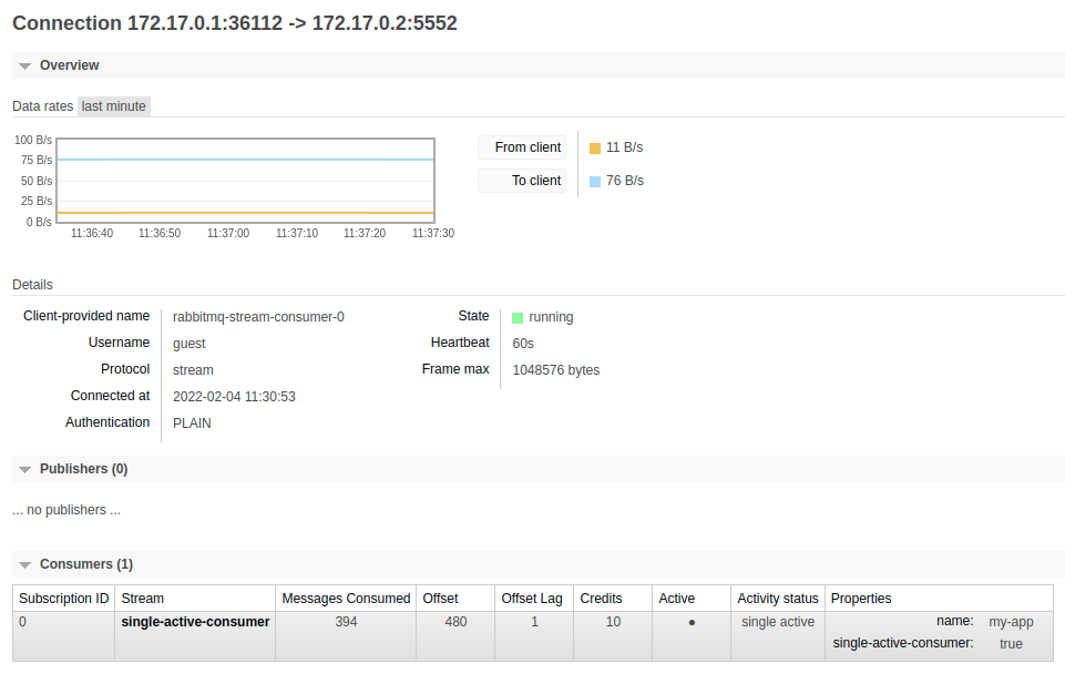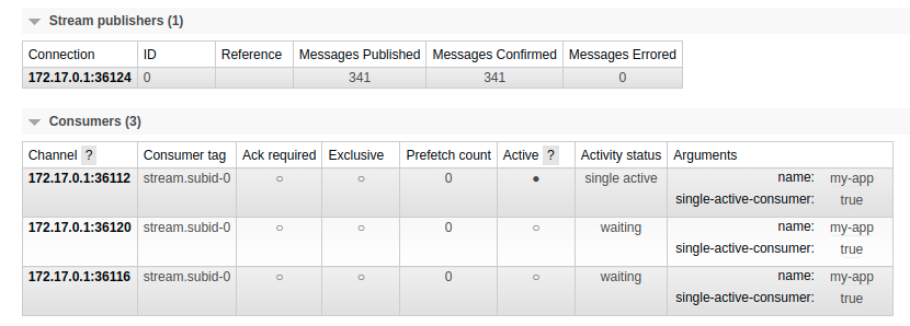 You should see the 3 consumers of the group, with their subscription ID in the connection, their owning connection, and their state. This command lists only the consumers of a given group, not other consumers. Go to the page of the stream in the management UI: You should see the consumers with the same details as in the output of the Click on the link to the connection (channel column) of the active consumer: This is a stream-specific page, so you should see extra information about the consumer (consumed messages, offset, etc). Check the state column says the consumer is active. Go back to the Check the state column says the consumer is not active. Now go back to the page of the connection of the active consumer and close the connection (link at the bottom of the page). The output of the consumer program should say the next consumer took over: