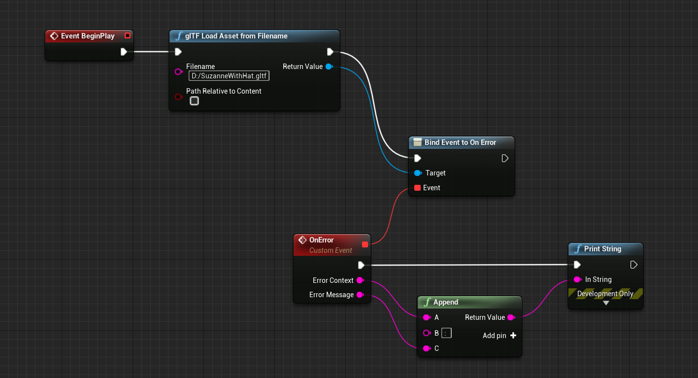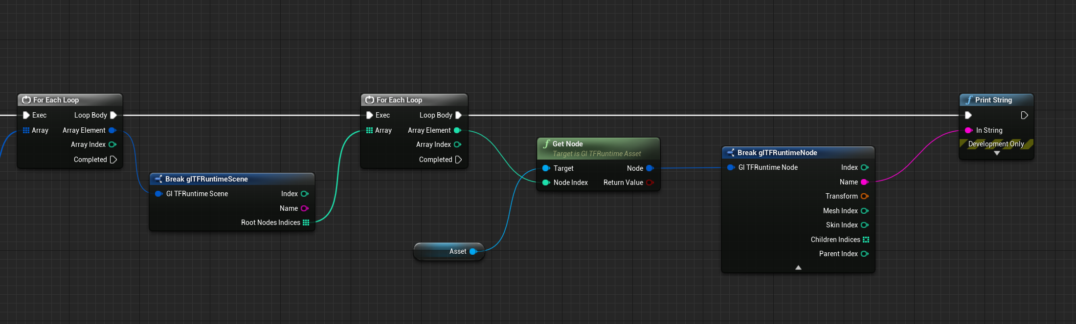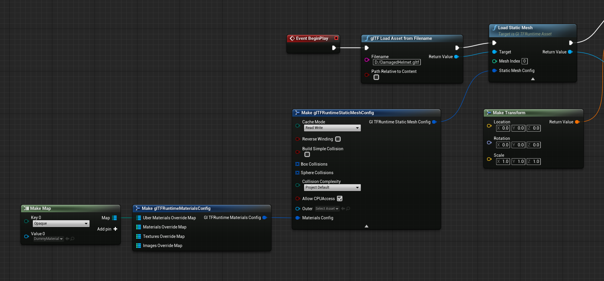 - Always check for invalid return value of the three main functions (glTFLoadAssetFromFilename, glTFLoadAssetFromString, glTFLoadAssetFromUrl). NULL check in C++ will be good enough as well as the IsValid node on Blueprints.