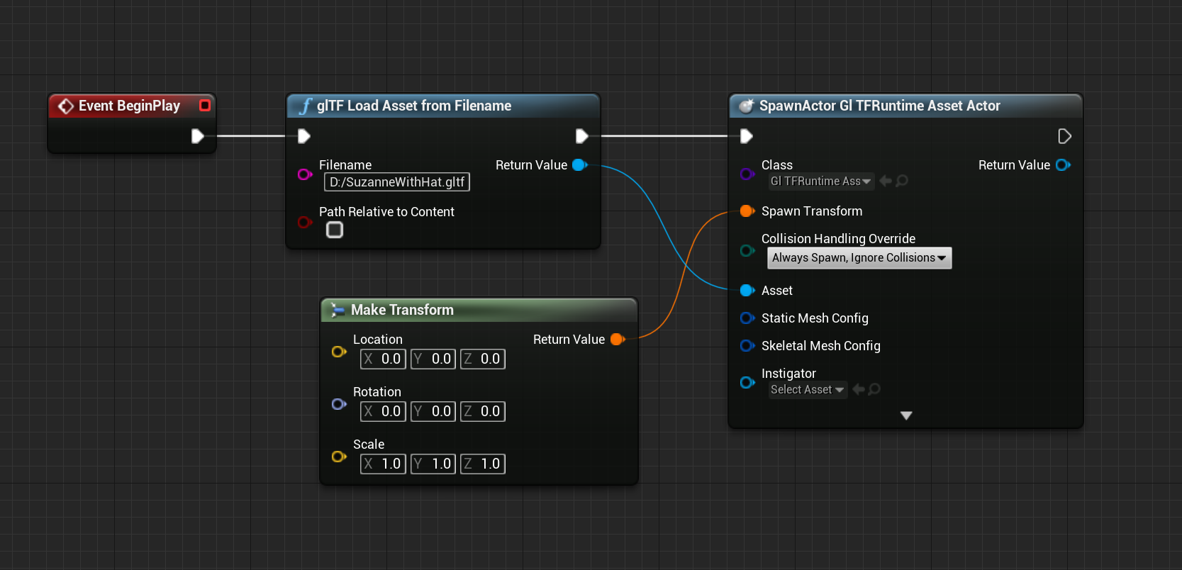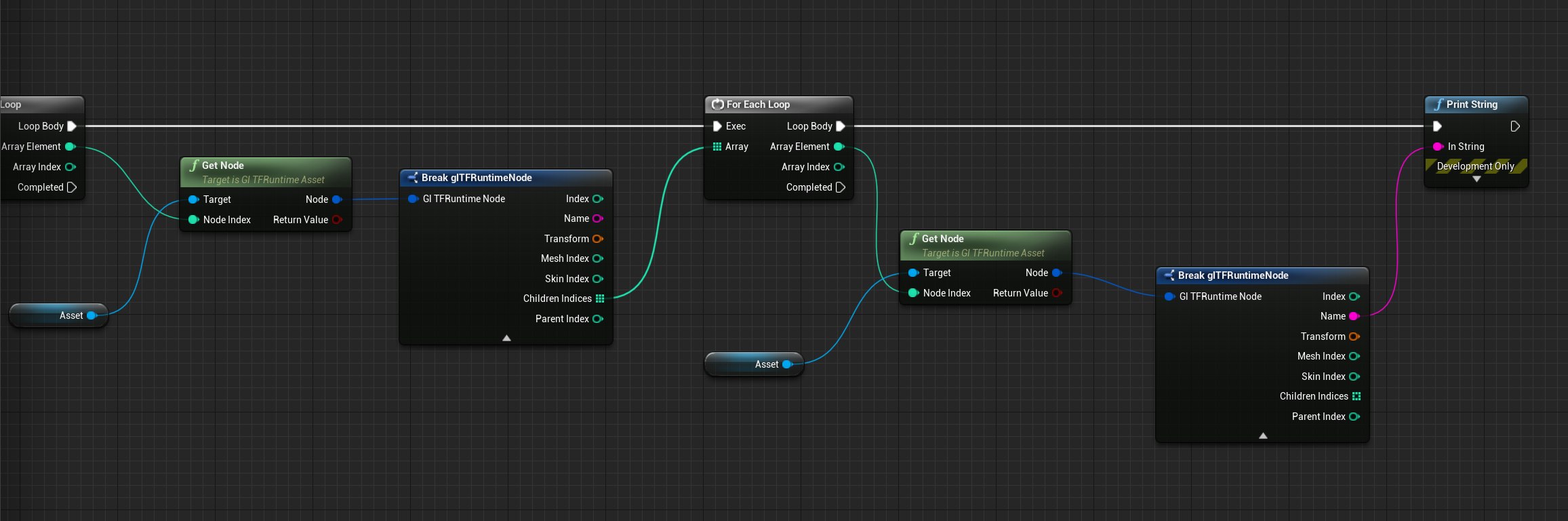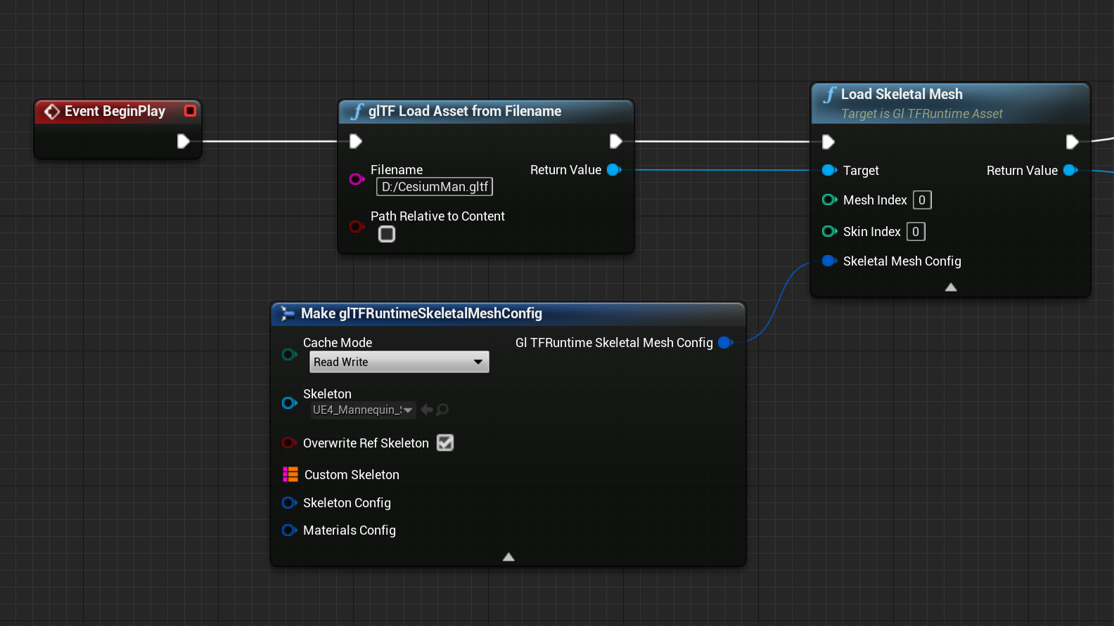 - Always check for invalid return value of the three main functions (glTFLoadAssetFromFilename, glTFLoadAssetFromString, glTFLoadAssetFromUrl). NULL check in C++ will be good enough as well as the IsValid node on Blueprints.