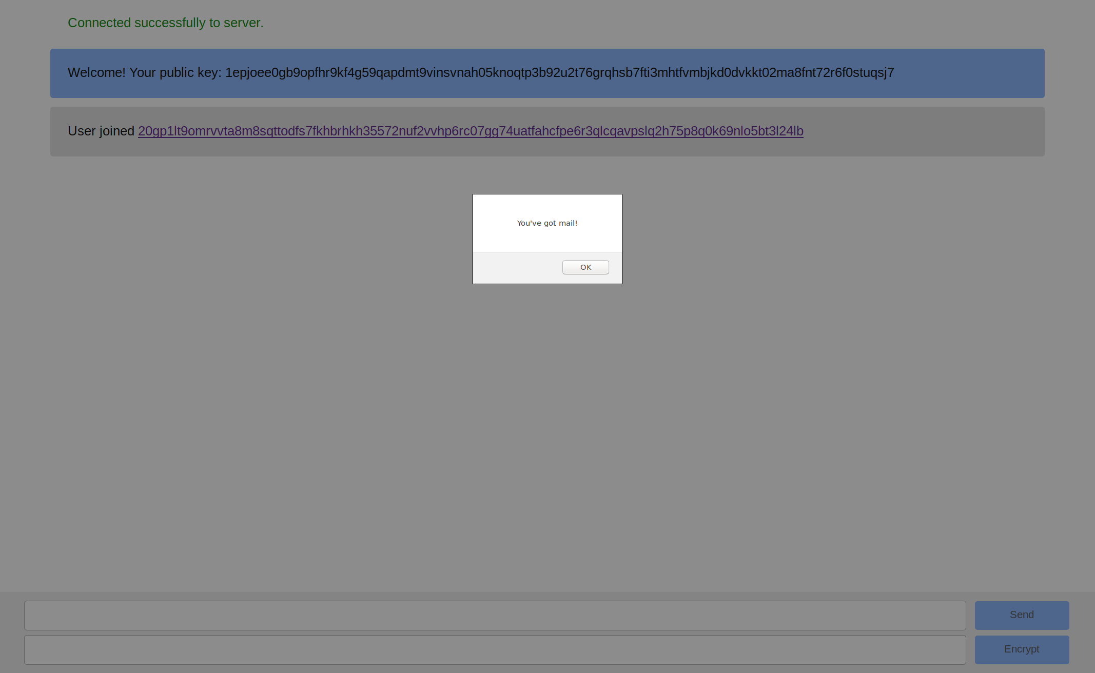 Once the user has joined they can send unencrypted or encrypted messages. To send encrypted messages, they can click on a joined user's public key which will be filled into the encrypt field and write the message they want to encrypt in the send field. After clicking the encrypt button, their message will be encrypted and replace the plaintext in the send field.