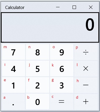 2. Each button on the calculator should be operated by typing the characters from 'a' to 'p'.