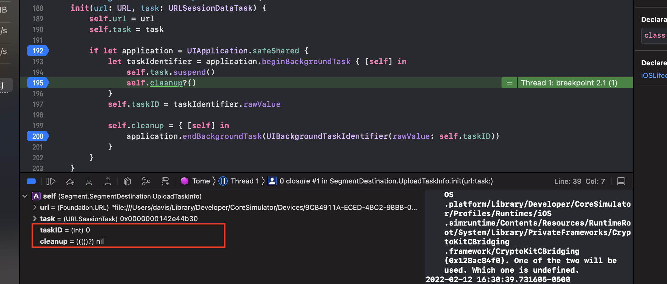 application.endBackgroundTaskis not called for tasks that do happen to expire in the backgroundUploadTaskInfoas a value type is captured bybeginBackgroundTaskbefore thecleanuphandler is assigned. You can see the issue by running version 1.0.6 where tasks expired often and set the breakpoint as seen in the attached screenshotMy fix is to no longer capture self in either closure.