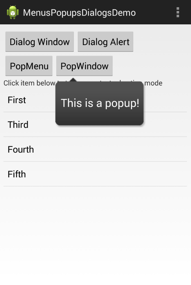 Android demo of menus, popups and dialogs. See the Menus and Popups cliffnotes for more details.
