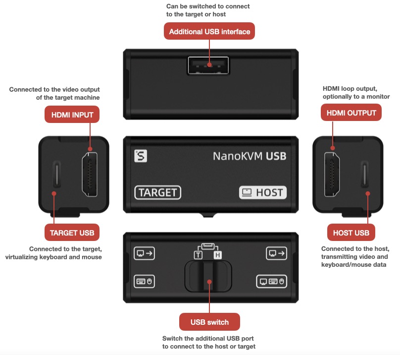 NanoKVM-USB captures HDMI video signals and transmits them to the host via USB 3.0. Unlike typical USB capture cards, NanoKVM-USB also captures keyboard and mouse input from the host and sends it to the target machine in real-time, eliminating the need for traditional screen and peripheral connections. It also supports HDMI loop-out, with a maximum resolution of 4K@30Hz, making it easy to connect to a large display.
