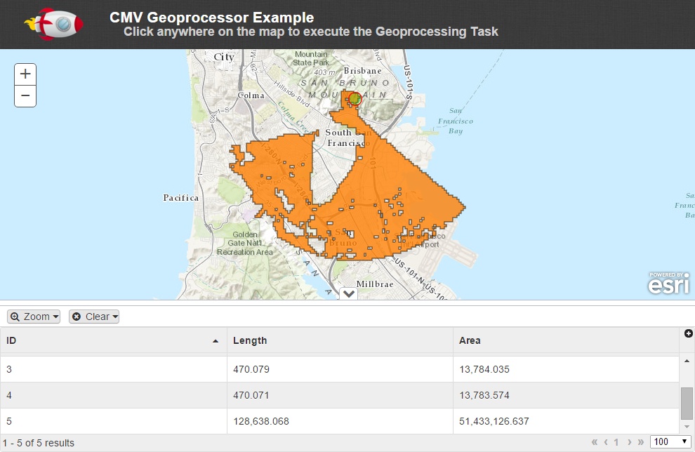 An example widget demonstrating the display of results from a Geoprocessing Task in the Attributes Tables widget.