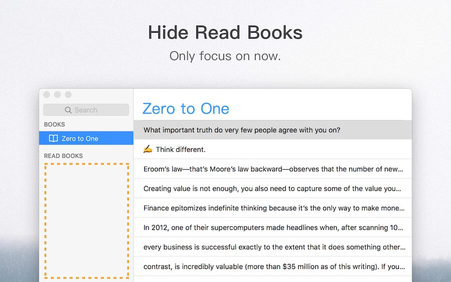 Klib is an app which groups all your read books together in one place. Your ‘read books’ group can be collapsed. You can even hide the book list and only read the notes.