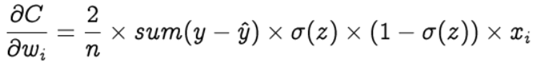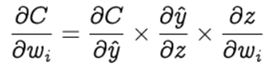 Step 2: In order to find the best weights and bias for our Perceptron, we need to know how the cost function changes in relation to weights and bias. This is done with the help of the gradients (rate of change) — how one quantity changes in relation to another quantity. In our case, we need to find the gradient of the cost function with respect to the weights and bias. Let’s calculate the gradient of cost function C with respect to the weight wᵢ using partial derivation. Since the cost function is not directly related to the weight wᵢ, let’s use the chain rule.