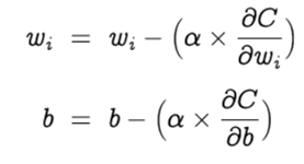 Optimization is the selection of the best element from some set of available alternatives, which in our case, is the selection of best weights and bias of the perceptron. Let’s choose gradient descent as our optimization algorithm, which changes the weights and bias, proportional to the negative of the gradient of the cost function with respect to the corresponding weight or bias. Learning rate (α) is a hyperparameter which is used to control how much the weights and bias are changed. The weights and bias are updated as follows and the backpropagation and gradient descent is repeated until convergence [4].