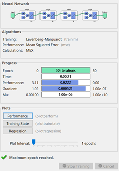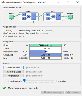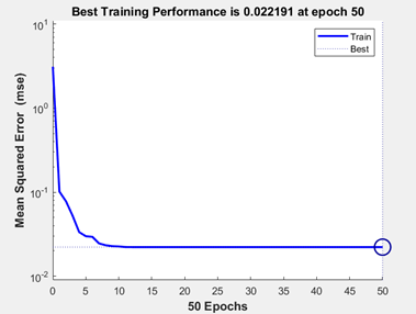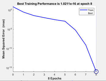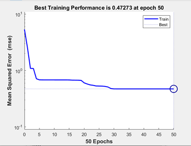 section, we finally trained the neural network with 50 epoch. Finally, we can check our accuracy and simulate our network as A = sim(net, P);