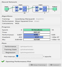 We have one hidden layer and 10 epochs for the ANN (Figure 24). According to performance (Figure 25), which is the mean squared error method, we have a 0.06 MSE value. This performance can be improved by tuning some hyperparameters such as changing hidden layer numbers or increasing epoch numbers. However, we still have good performance and results as it is seen in Figure 26 because every diagonal element has the highest probability. This means that, for example, the first diagonal element is the probability of prediction of image 1 so that we have a 93.46% chance to predict image 1 which is a very good performance.
