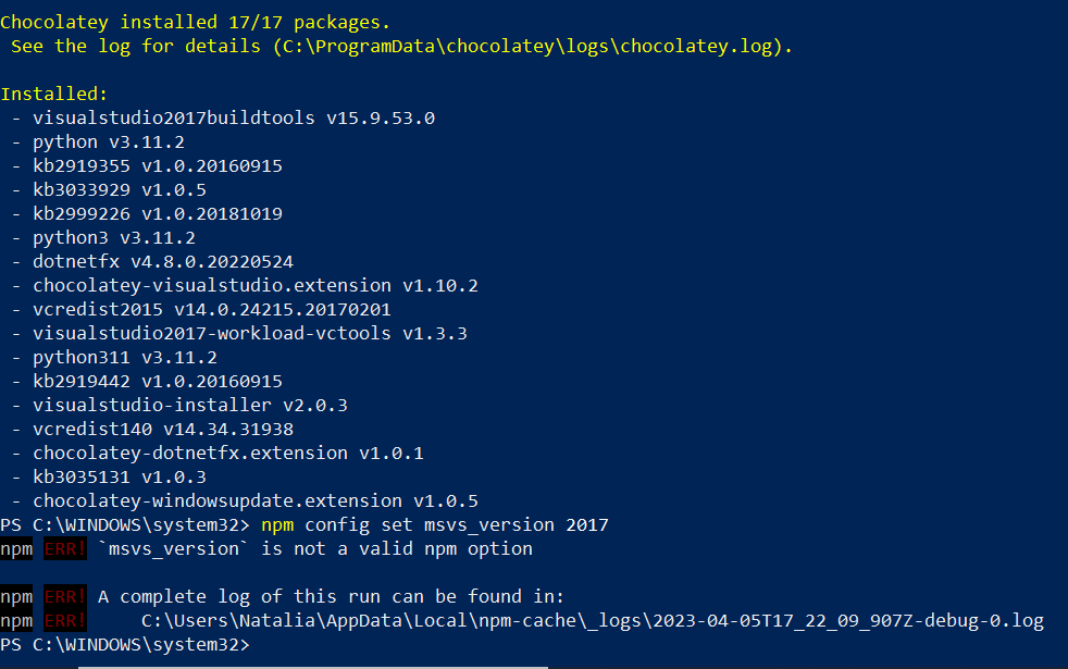 After running, choco install python visualstudio2017-workload-vctools -y on Windows, some users are reporting an error when trying to set the msvs_version option in npm using the command npm config set msvs_version 2017. The error message says that msvs_version is not a valid npm option. This issue is causing problems for users who are trying to set up their Windows environment for development.