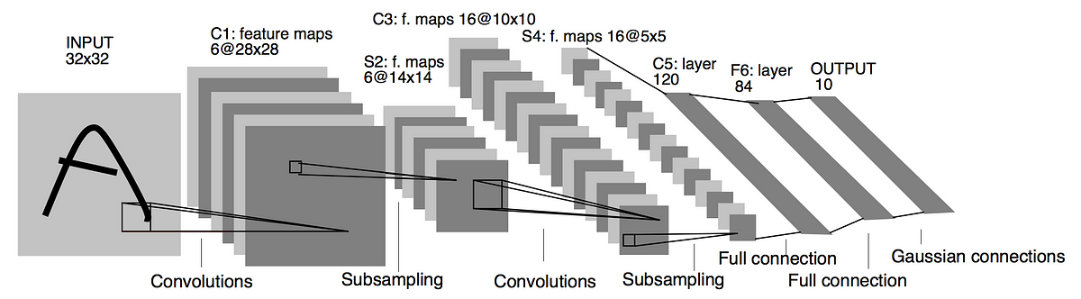 Here is an image that shows the overall architecture of LeNet-5, taken from a paper published by Yann LeCun: