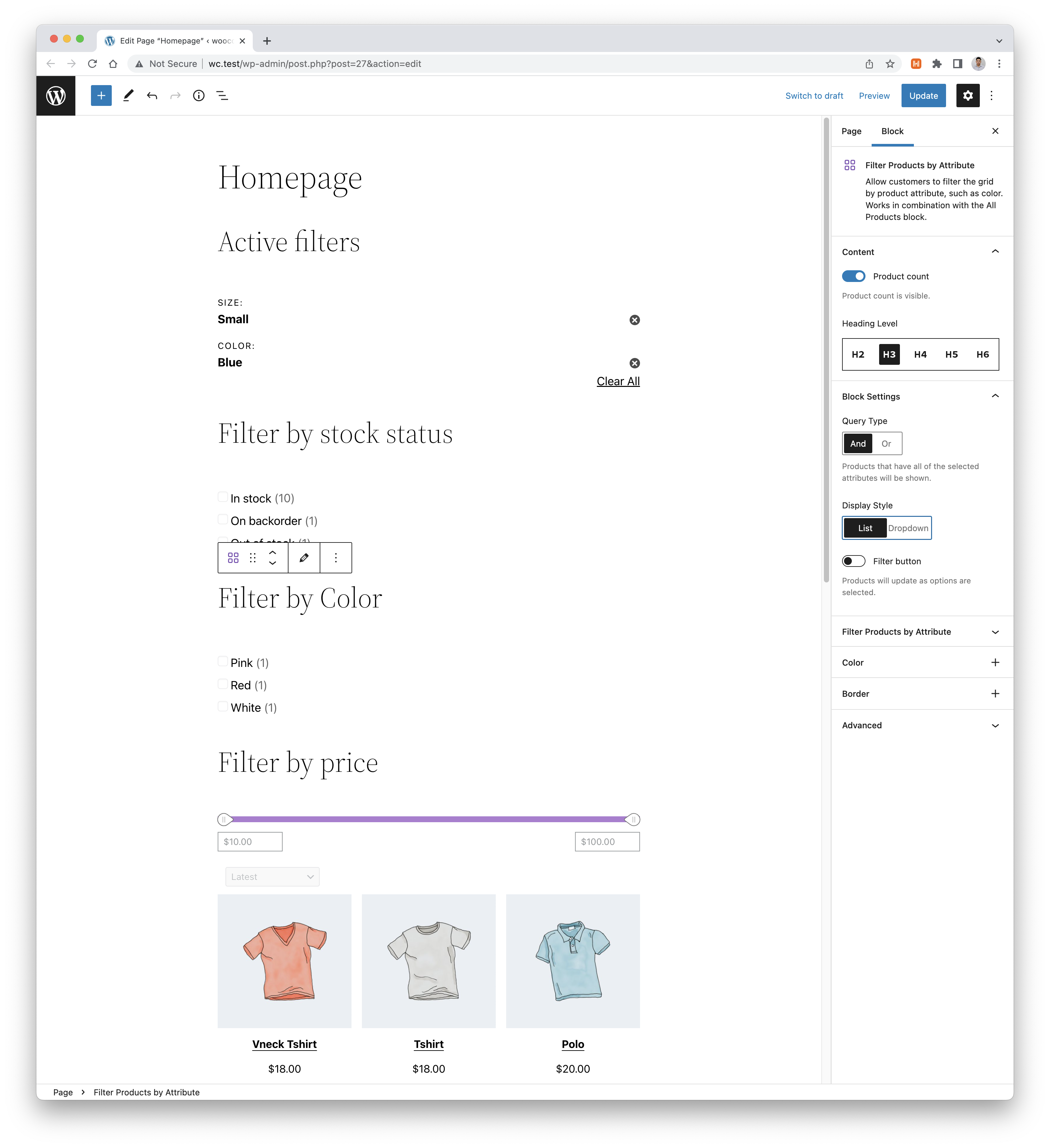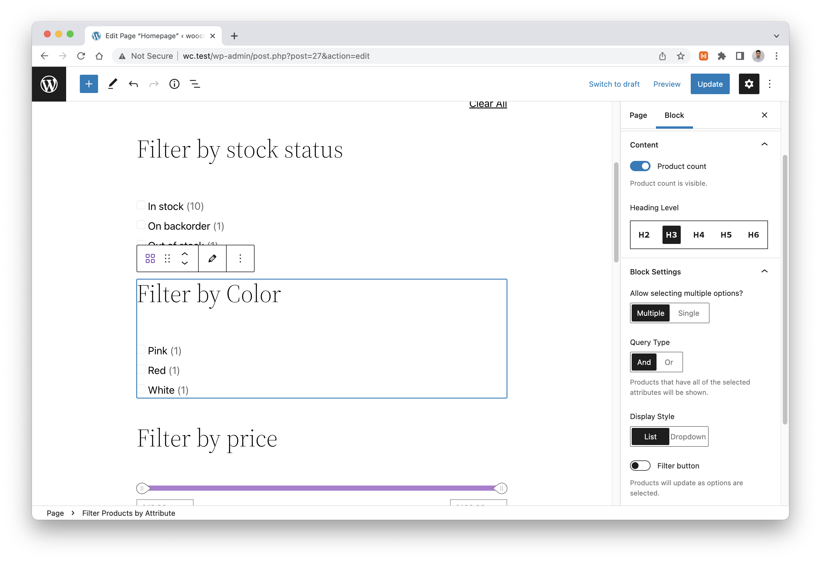 Attempt block recoverybutton for that block.Allow selecting multiple options?set to Multiple by default.Single. See theQuery Typesetting disappear.Multiple. Set display style toDropdownand query type toAND.WooCommerce Visibility