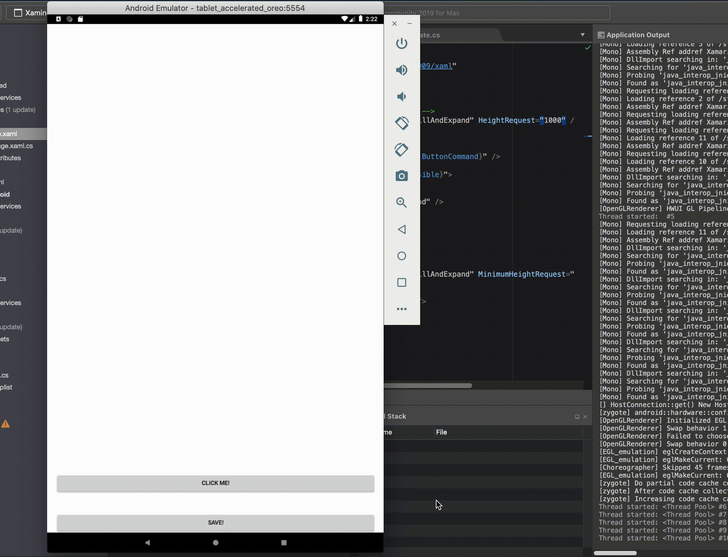 The StackLayout becomes visible but pushes the Save! button out of frame. This can be resolved by rotating the tablet for a bit so that we force a redraw