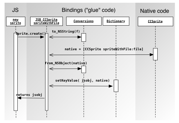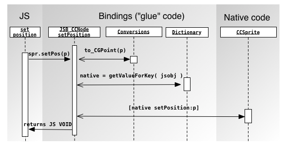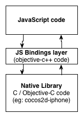 That means that you can interact with your favorite native library from JS. As an example, you could create a cocos2d particle system in JS, while its logic and rendering will be executed natively. Or you could create a Chipmunk Physics world in JS, while the whole physics simulation, including the collisions detections, would run natively.
